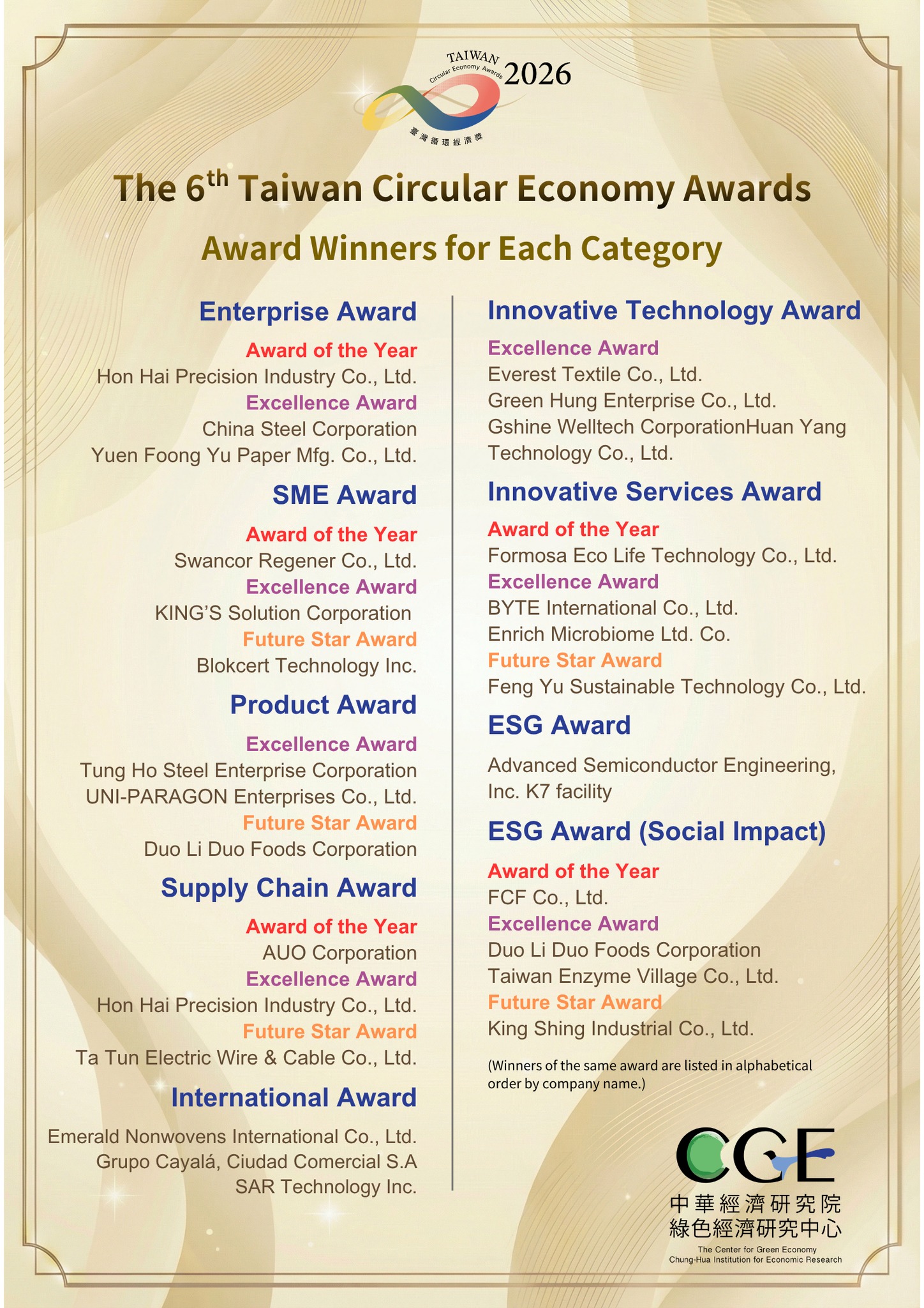 【Center for Green Economy】Winners of the 6th Taiwan Circular Economy Award Officially Announced!